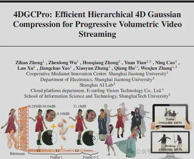 近年来,体积视频(Volumetric Video)作为沉浸式媒体的重要形式,逐渐成为虚拟现实、增强现实及未来互联网应用的关键内容载体。然而,与传统二维视频相比,体积视频在存储、传输带宽与实时渲染等方面仍面临显著挑战,尤其在网络条件不稳定的移动端设备上,这一问题更为突出。针对现有方法存在单一模型多码率支持不足、实时解码性能有限以及复杂运动场景鲁棒性不佳等问题,上海交通大学、上海AI Lab、上海科技大学等单位的研究团队联合天翼视讯科技有限公司提出了一种新的压缩框架——4DGCPro,首次在动态高斯表征单一模型中实现了多码率支持,并能在手机等轻量级设备上完成实时解码与高保真渲染。