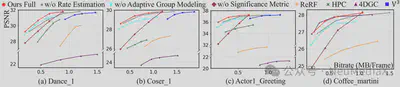 作者在 N3DV、HiFi4G 和自建 4DGCPro 数据集 上进行了全面实验,对比了 ReRF、HPC、3DGStream、4DGC、HiCoM、V3 等方法。